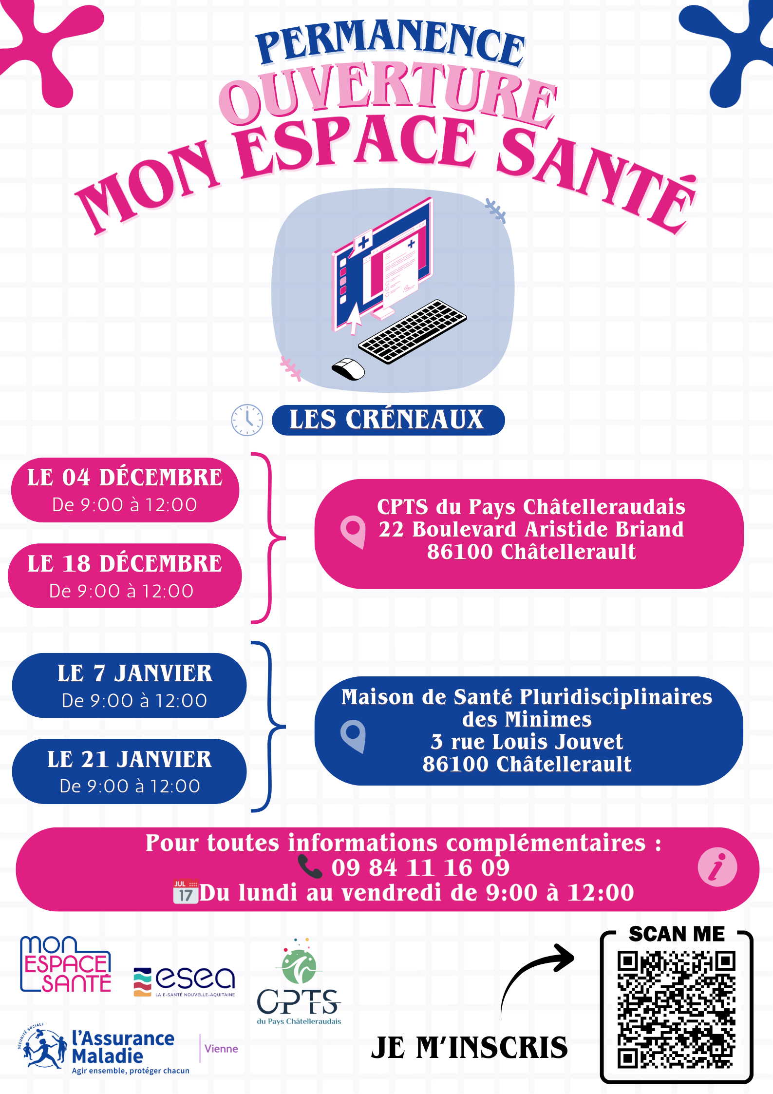 🖥️ Dans le cadre d’un partenariat avec l’ESEA et la CPAM 86, des ateliers d’accompagnement Ă l’ouverture de “Mon Espace SantĂ©” s’organisent sur plusieurs dates.