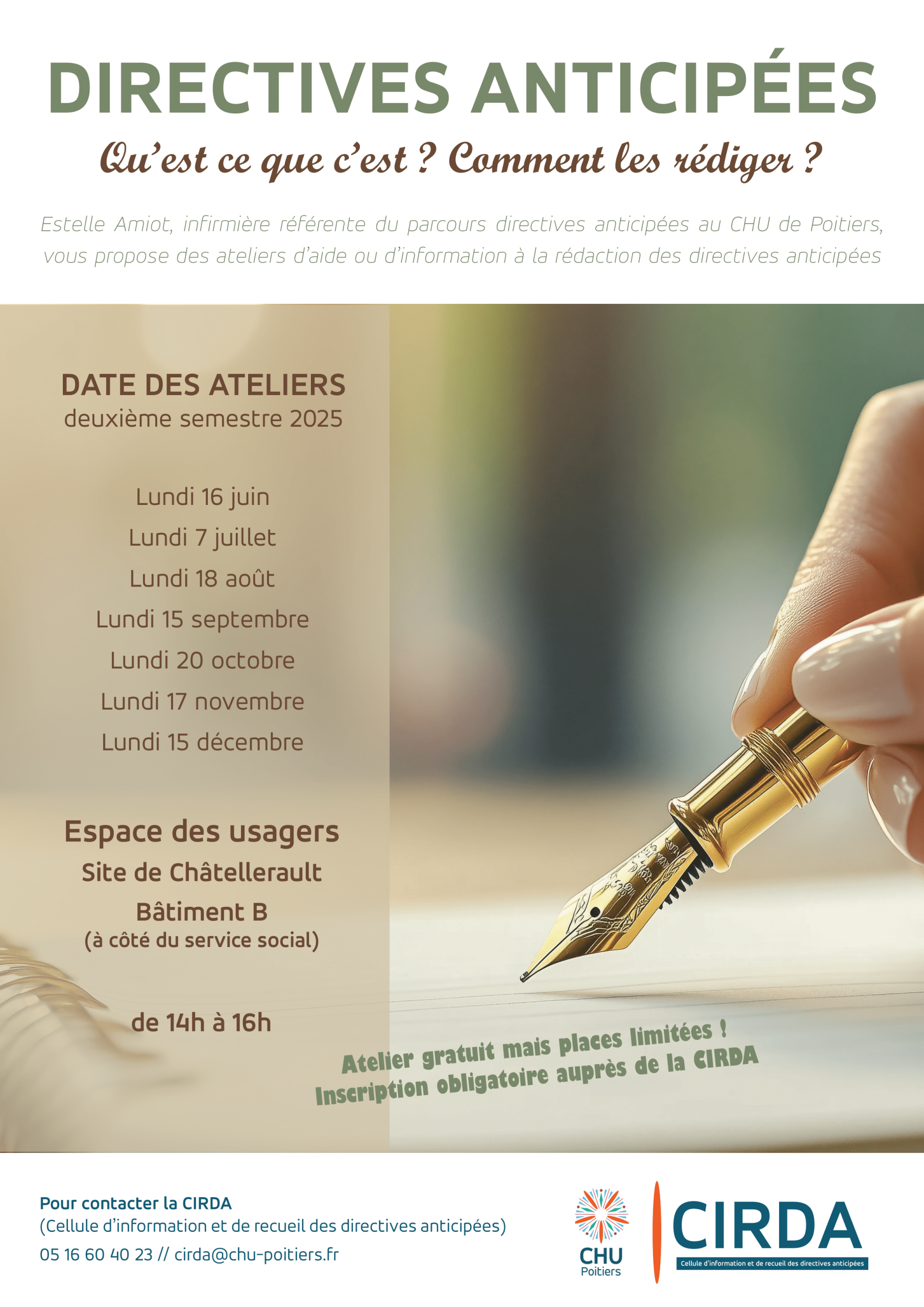 Estelle Amiot, infirmière référente du parcours directives anticipées au CHU de Poitiers, vous propose des ateliers d’aide ou d’information à la rédaction des directives anticipées.