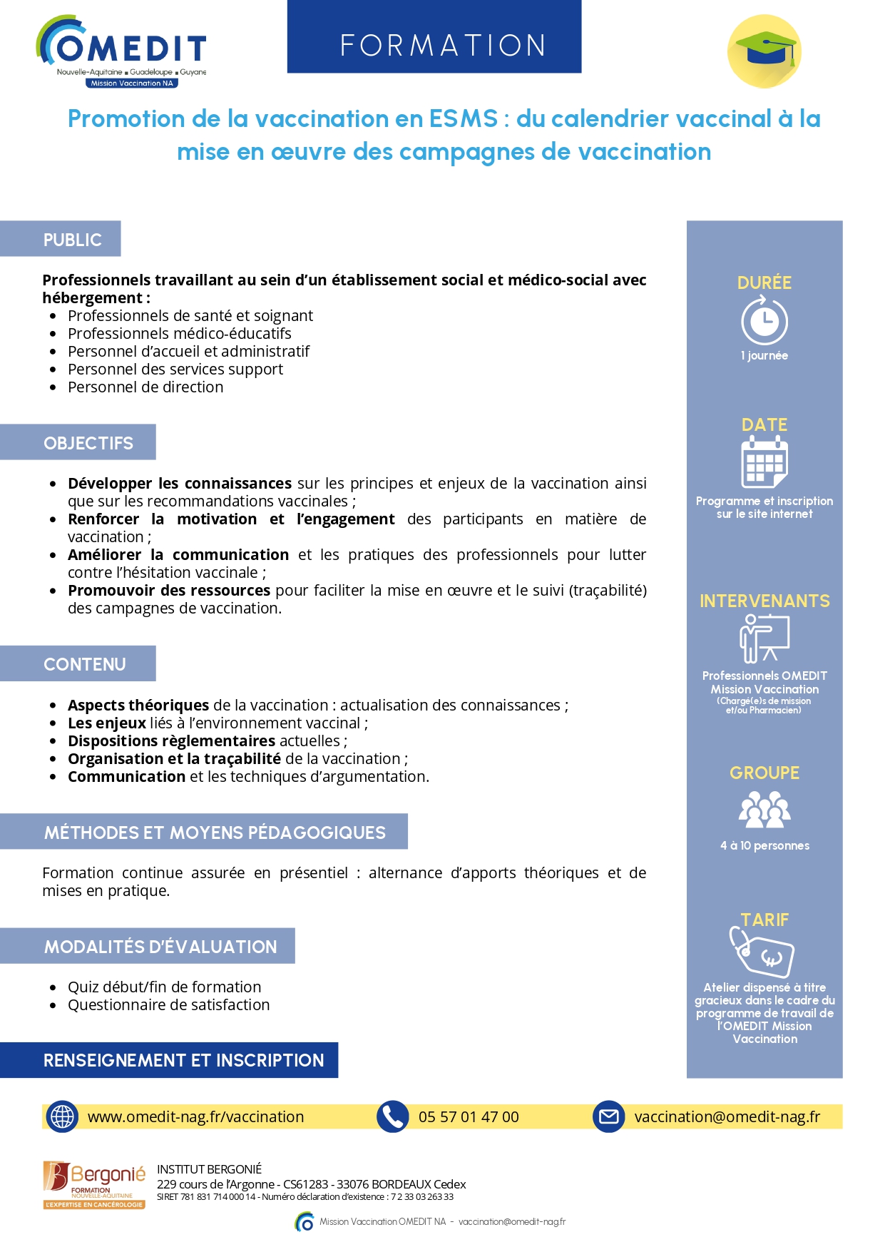 • Professionnels concernés : professionnel de santé travaillant au sein d’un ESMS ou en relation avec le circuit des vaccins (médecin, pharmacien, préparateur, cadre, aide-soignant, personnel administratif et de direction, … travaillant dans un établissement et service social ou médico-social)