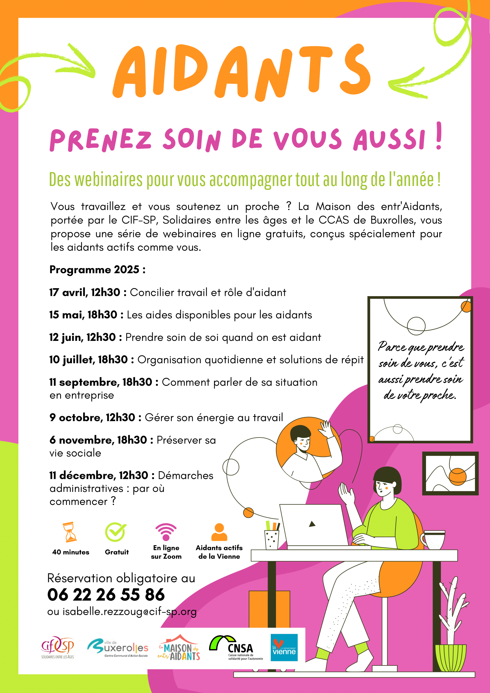 PRENEZ SOIN DE VOUS AUSSI ! Des webinaires pour vous accompagner tout au long de l'année! Vous travaillez et vous soutenez un proche ? La Maison des entr'Aidants, portée par le CIF-SP, Solidaires entre les âges et le CCAS de Buxrolles, vous propose une série de webinaires en ligne gratuits, conçus spécialement pour les aidants actifs comme vous. Programme 2025 : 🗓️11 décembre, 12h30 : Démarches administratives : par où commencer ? 🛜 En ligne sur zoom ⌛ 40 minutes ✅ Gratuit Réservation obligatoire au 06 22 26 55 86 ou isabelle.rezzoug@cif-sp.org En savoir plus ici