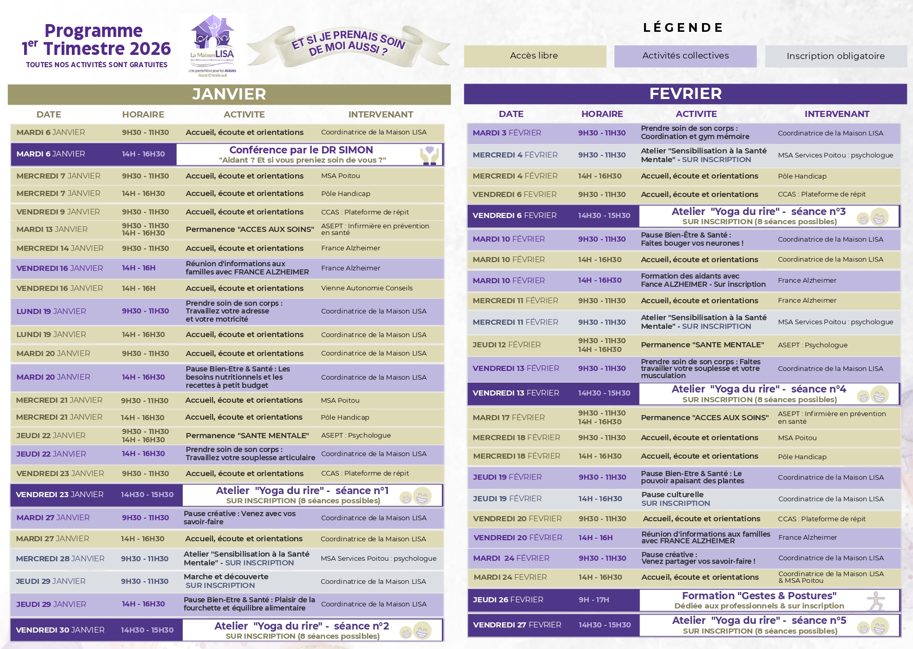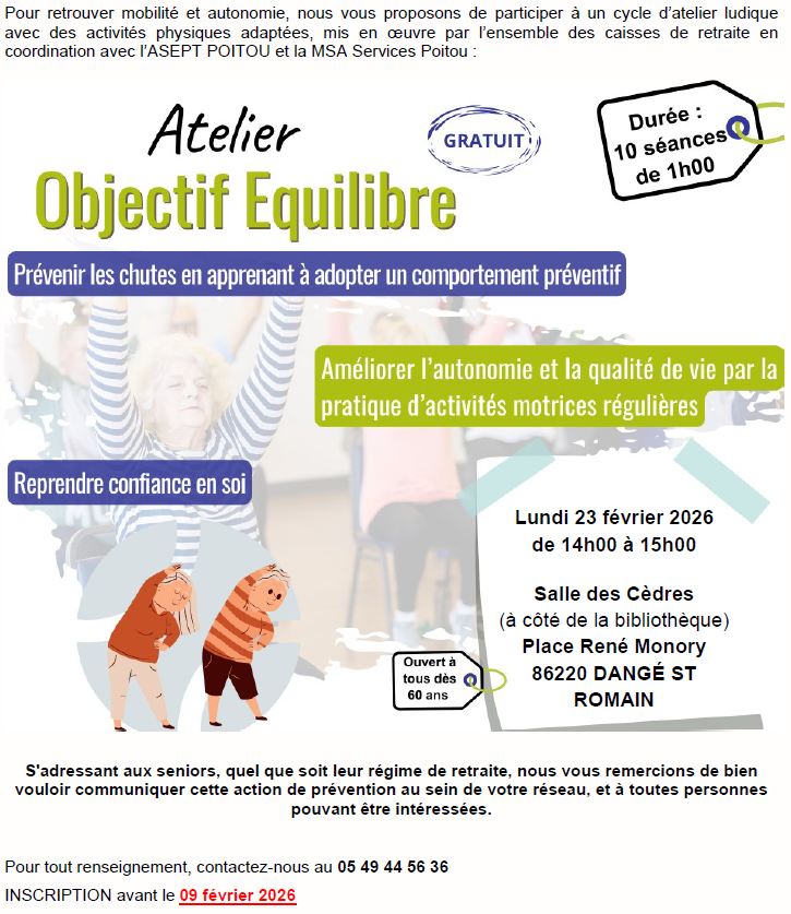Pour retrouver mobilité et autonomie, la MSA Services Poitou vous propose de participer à un cycle d'atelier ludique avec des activités physiques adaptées, mis en œuvre par l'ensemble des caisses de retraite en coordination avec l'ASEPT POITOU et la MSA Services Poitou Objectifs : Prévenir les chutes en apprenant à adopter un comportement préventif Améliorer l'autonomie et la qualité de vie par la pratique d'activités motrices régulières Reprendre confiance en soi Ouvert a tous dès 60 ans, gratuit Pour tous renseignements 📞 05 49 44 56 36 INSCRIPTION avant le 09 février 2026 Je m'inscris Le programme